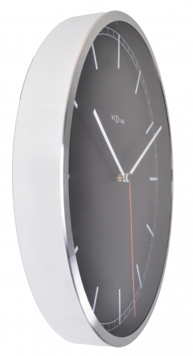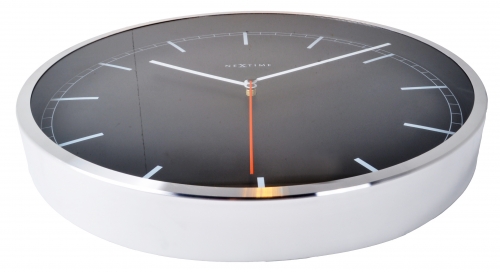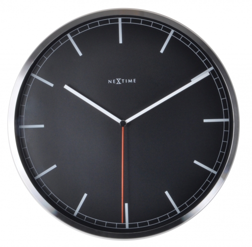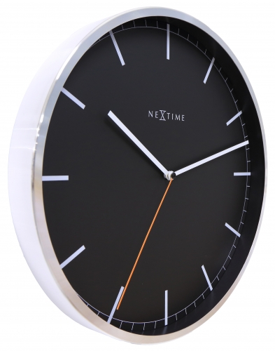 De NeXtime Company Black wandklok combineert een professionele look met een moderne styling. Dit zakelijke design is met zijn moderne uitstraling perfect voor elk kantoor. De klok heeft een smalle verchroomde aluminium rand met een zwarte wijzerplaat en een witte uuraanduiding met strepen. Deze klok heeft een glasplaat voor de wijzerplaat en de rode secondewijzer loopt geleidelijk rond waardoor de klok geluidloos is. Afm. Ã35cm