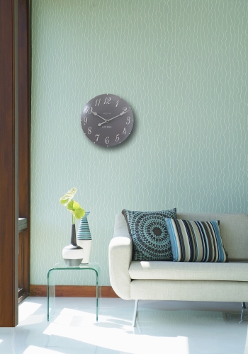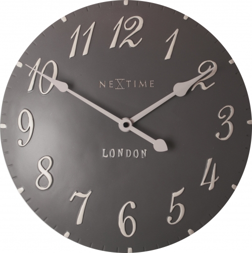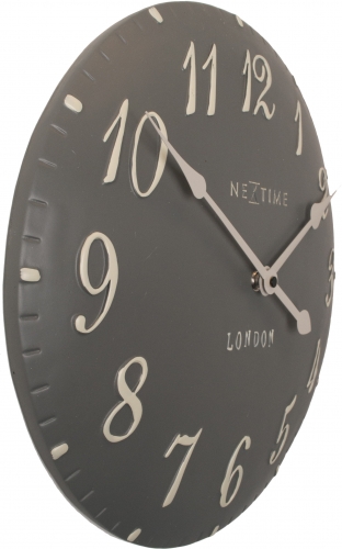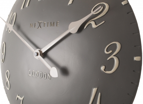 De London Arabic wandklok brengt een stukje London in huis. De grijze poly resis wijzerplaat loopt bol en de 3D uuraanduiding bestaat uit witte sierlijke cijfers. Door zijn moderne uitstraling past deze klok in elk interieur. Afm. Ã34.5cm