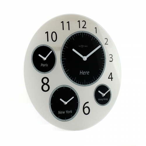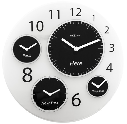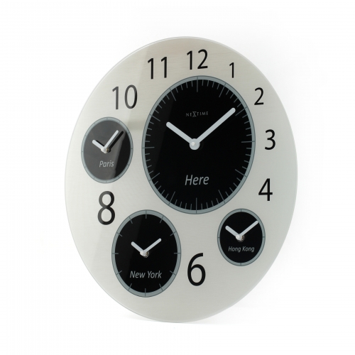 De NeXtime Big World wandklok is gemaakt van gematteerd glas. Deze klok geeft in het groot de huidige tijd weer en in het klein de tijden in New York, Londen en Tokyo. Hang deze praktische en stijlvolle klok in bijvoorbeeld uw keuken, woon- of slaapkamer. Afm. Ã52cm