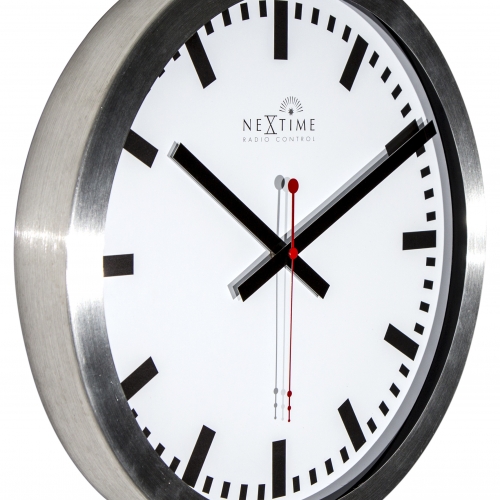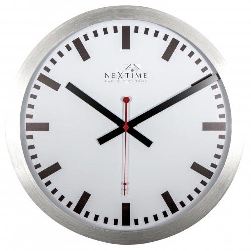 De NeXtime Station wandklok is een favoriet bij vele klokliefhebbers. Deze klok combineert een bekend en traditioneel ontwerp met de NeXtime stijl. De klok heeft een aluminium rand met een witte wijzerplaat. De zwarte strepen geven de uuraanduiding aan. De rode opengewerkte secondewijzer loopt geleidelijk rond, waardoor de klok geluidloos is. Deze klok is radio controlled, waardoor u nooit meer de tijd goed hoeft te zetten, dat gaat vanzelf! Afm. Ã35cm