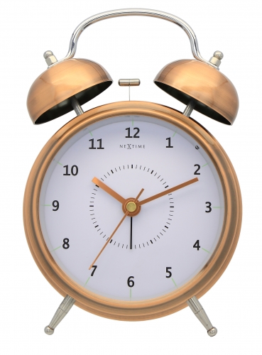 De NeXtime Wake Up wekker heeft een klassieke uitstraling door de koperkleurige buitenkant met alarmbellen, een witte wijzerplaat en een zwarte uuraanduiding. Voor de wijzerplaat zit een glasplaat. Tijd en wektijd kunnen eenvoudig met een draaiknop worden ingesteld en het alarm werkt met een aan/uit knop. In deze wekker zit verlichting en is een stil uurwerk verwerkt, handig voor in de slaapkamer. Afm. Ã15cm
