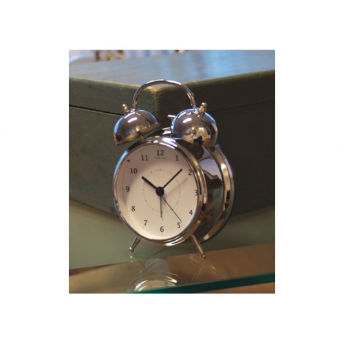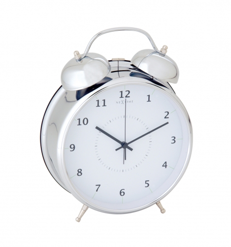 De NeXtime Wake Up wekker heeft een klassieke uitstraling door de chromen buitenkant met alarmbellen, een witte wijzerplaat en een zwarte uuraanduiding. Voor de wijzerplaat zit een glasplaat. Tijd en wektijd kunnen eenvoudig met een draaiknop worden ingesteld en het alarm werkt met een aan/uit knop. In deze wekker zit verlichting en is een stil uurwerk verwerkt, handig voor in de slaapkamer. Doe eens gek, en plaats de wekker niet op uw nachtkastje, maar hang deze wekker op aan de muur. Afm. Ã23cm