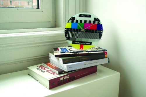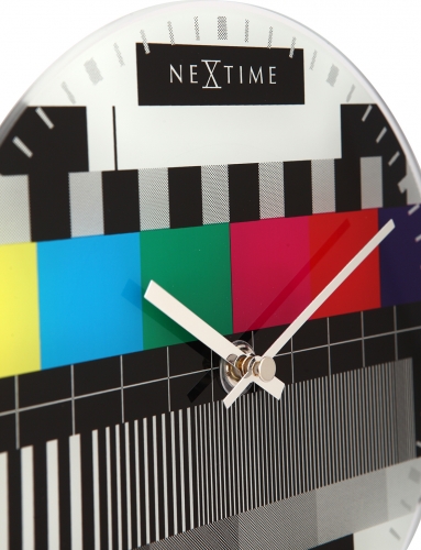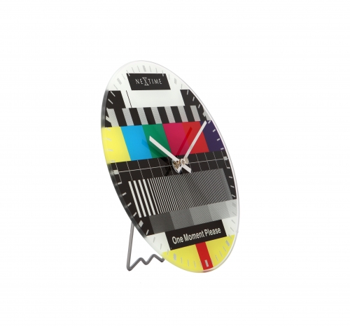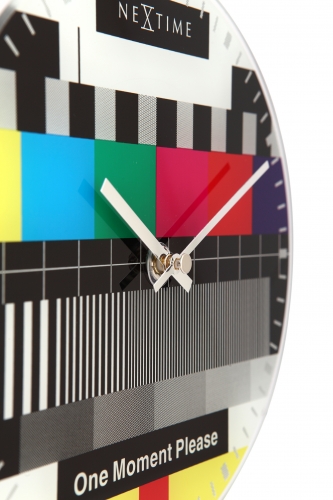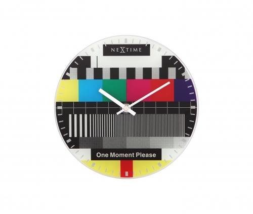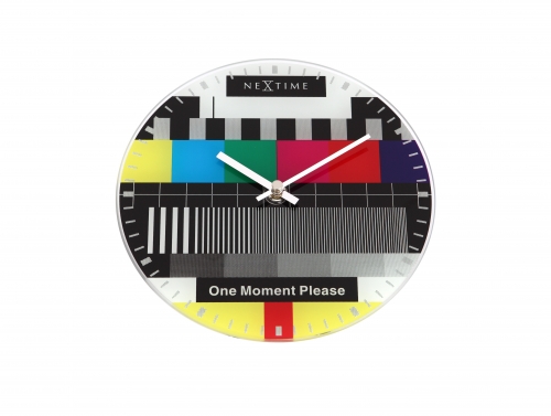 De NeXtime Little Testpage glasklok is bedrukt met een kleurrijke afbeelding van een televisie testbeeld zoals wereldwijd bekend. Door het ontbreken van de getallen kan aan de hand van strepen langs de rand van de klok de tijd worden afgelezen. In een zwarte balk staat 'One moment please'. De Testpage is een aanwinst in elk interieur. Afm. Ã20cm