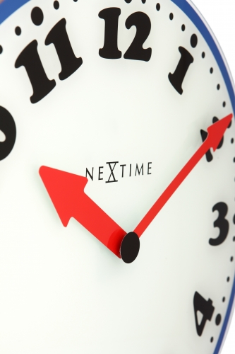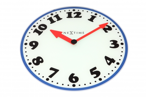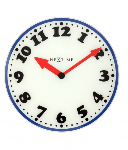 De NeXtime Boy glasklok heeft een smalle blauwe rand en een witte wijzerplaat. Dit klokdesign heeft een grappige en expressieve uitstraling en is het perfecte item voor aan de muur! De dikgedrukte zwarte cijfers van deze klok en de rode pijlvormige wijzers zijn op een speelse manier afgebeeld en dat maakt de look van deze wandklok helemaal af. Door het simpele, maar toch opvallende design past deze klok perfect in elk huis. Afm. Ã43cm