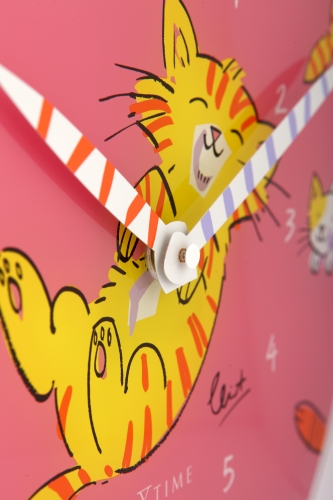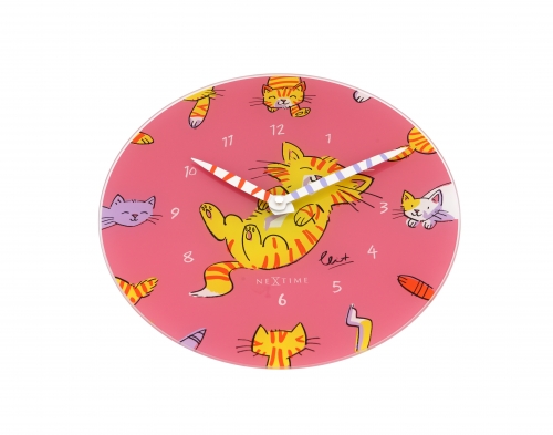 De Tickle My Tummy wandklok heeft een roze wijzerplaat waarop verschillende katten zijn bedrukt die de uren weergeven. In het midden van deze glasklok is een grote afbeelding zichtbaar van een slapende kat. Deze klok past met zijn vrolijke design perfect op de kinderkamer. Afm. Ã30cm